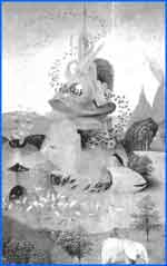 Schwarze Vögel – Symbol für die belasteten Seelen der Menschen – Sie laufen (unten im Bild) in ein Ei aus Stein – Symbol für die Eingeburt in den menschlichen Körper. Sie fliegen mehrmals hinein und heraus – und schließlich davon. Wollte Hieronymus Bosch damit das Freiwerden vom Rad der Wiedergeburt versinnbildlichen?
